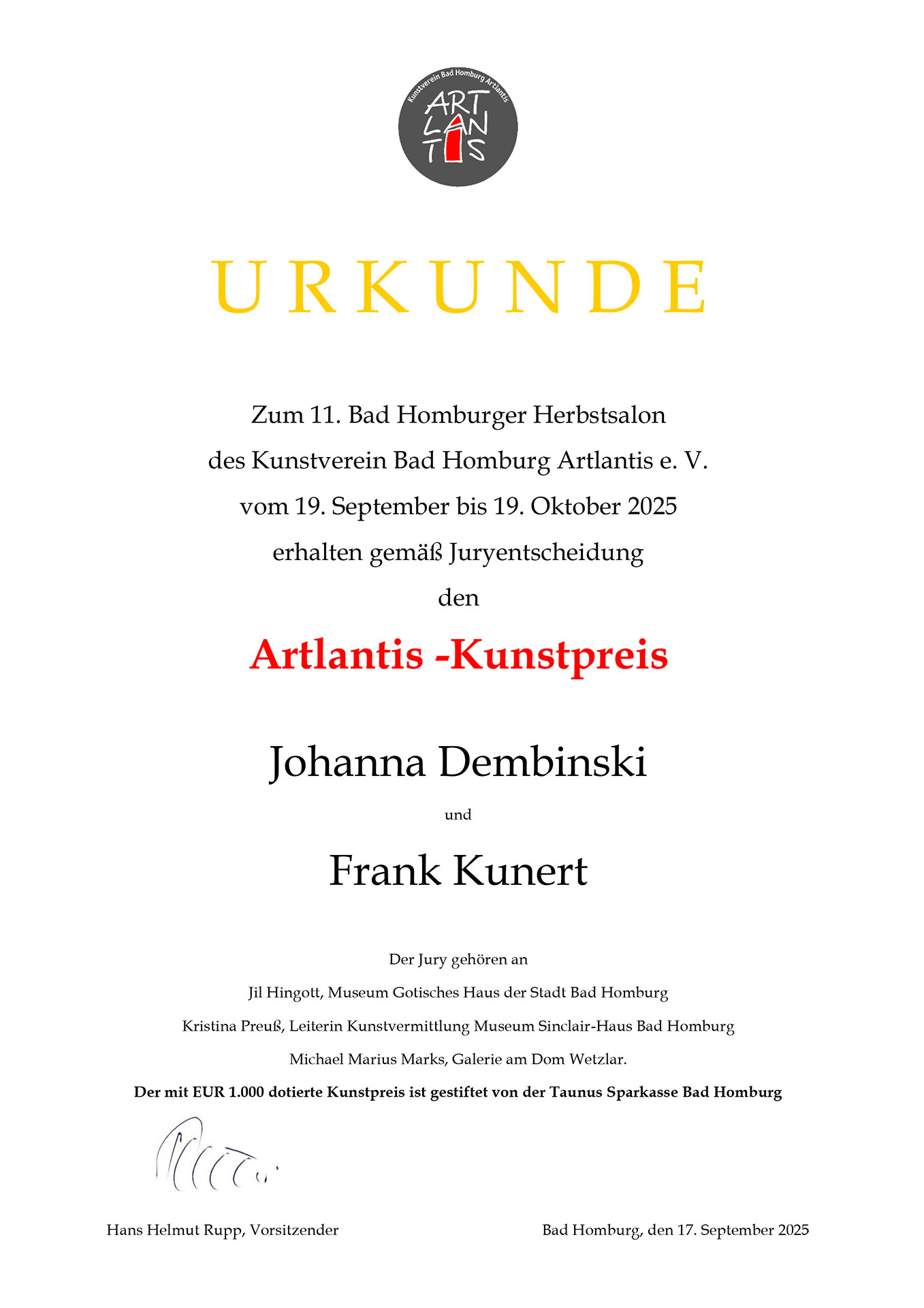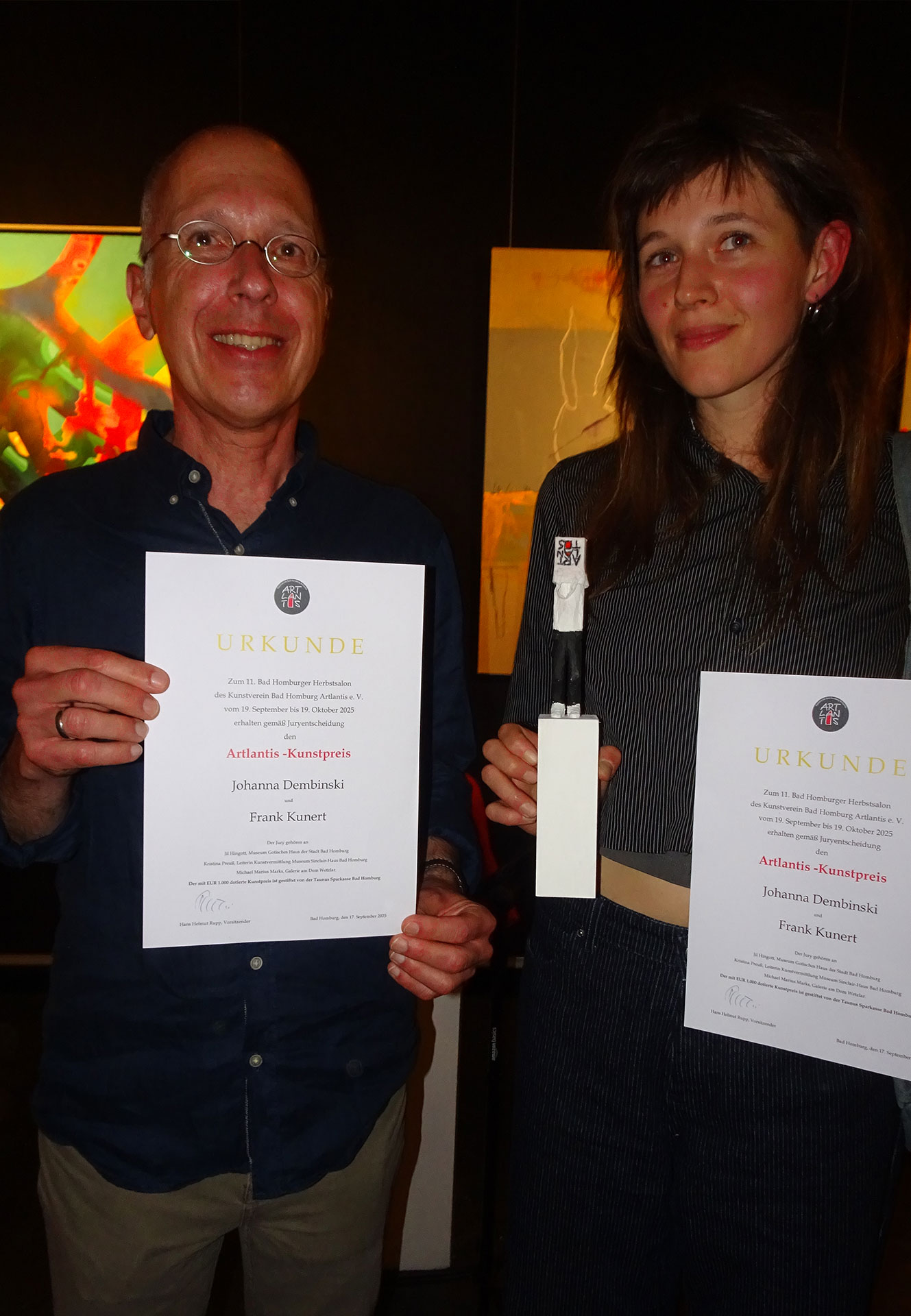 Die Jury hat in diesem Jahr beschlossen, den Artlantis-Kunstpreis zu teilen und damit sowohl eine etablierte als auch eine jüngere künstlerische Position auszuzeichnen. In der Diskussion spielte die Frage nach Alter und Bekanntheitsgrad der Kunstschaffenden eine Rolle – ausschlaggebend für die Entscheidung war jedoch die herausragende Qualität der künstlerischen Arbeiten. Das Preisgeld geht in diesem Jahr je zur Hälfte an Frank Kunert und zusätzlich mit dem Kunstpreis-Objekt an Johanna Dembinski.