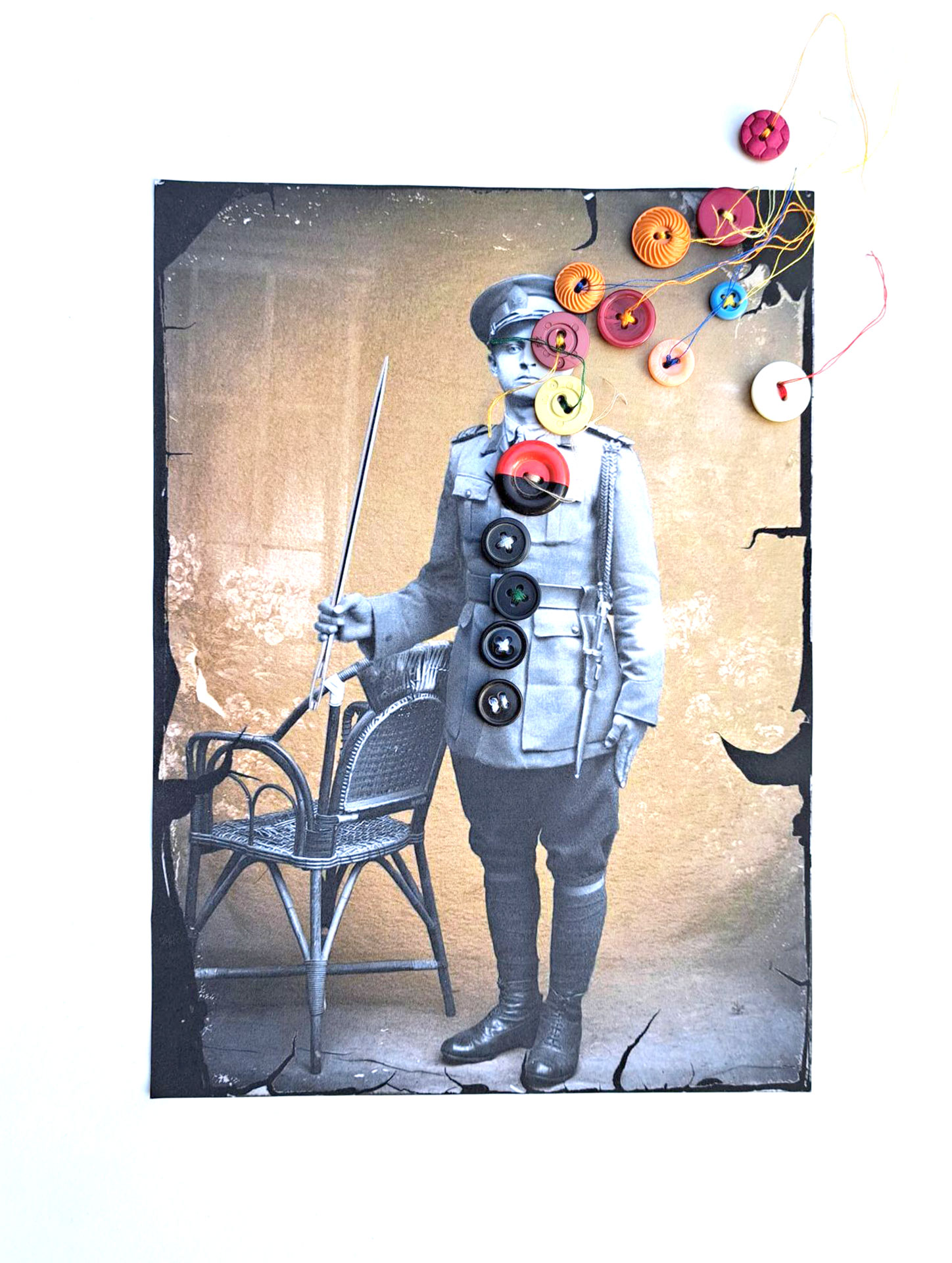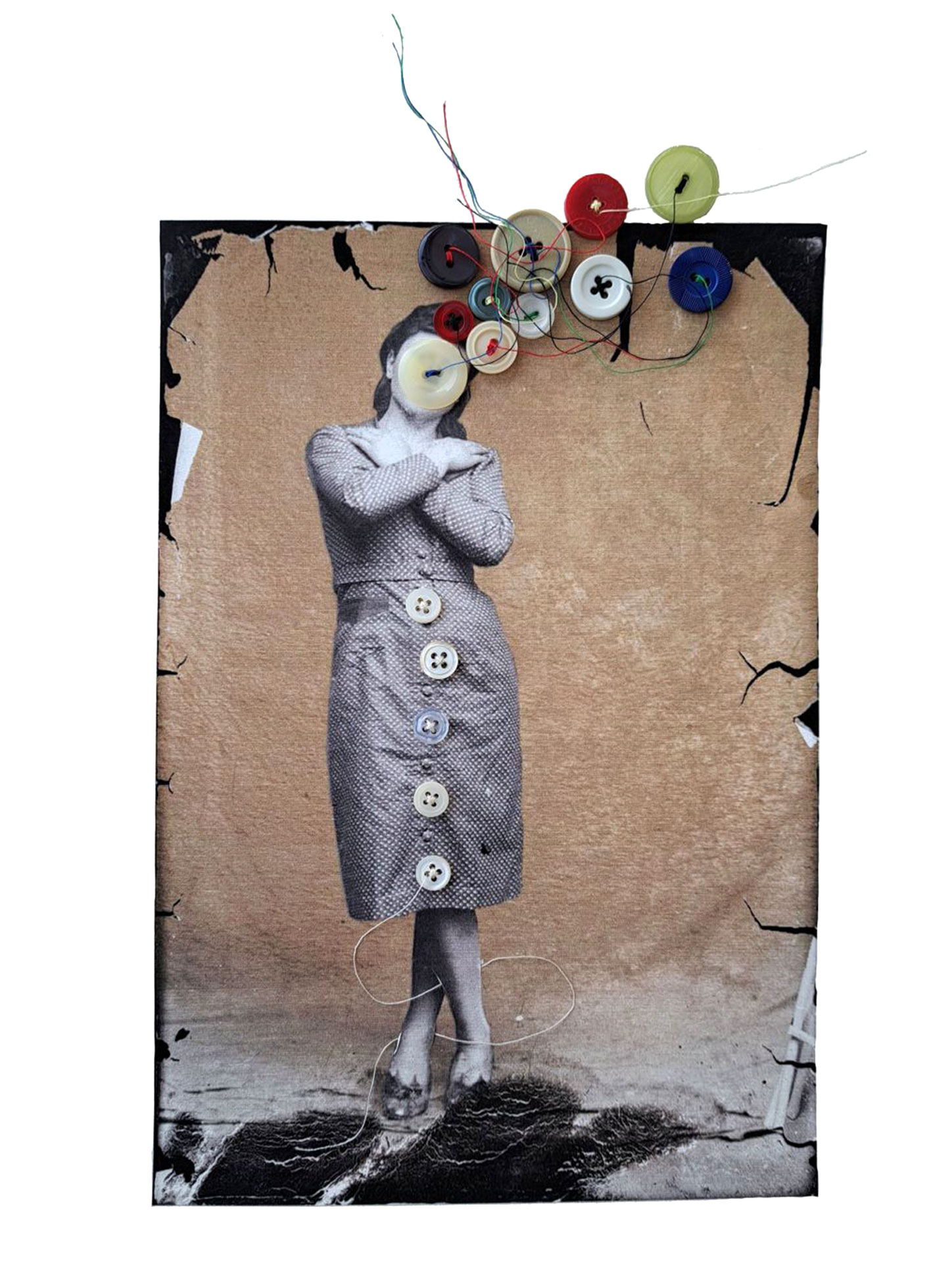 Digitale Collage auf Papier, Knöpfe, Fäden  ·  21 × 30 cm