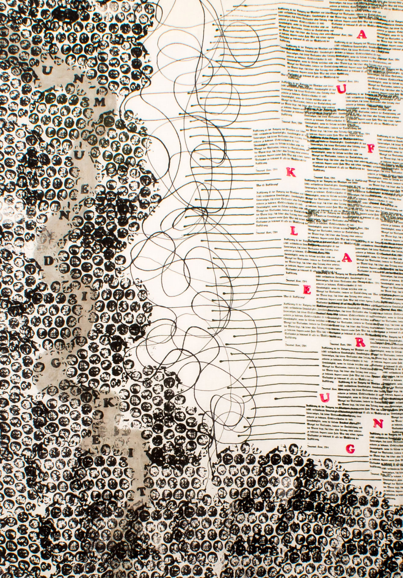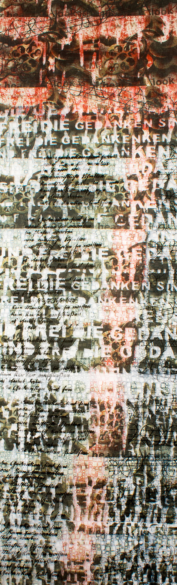 Meine textilen Arbeiten vereinen künstlerisches und handwerkliches Können. Der Schaffensprozess erfolgt schrittweise. Eigene Fotos sind der Ausgangspunkt, die zu einer Collage zusammengestellt die Basis der Papierlamination bilden. Mittels Siebdrucks werden die Fotos mit handschriftlich versehenen typografischen Elementen mit transparentem Stoff dauerhaft verbunden.