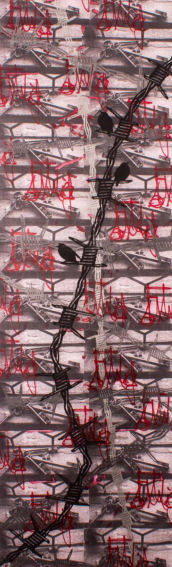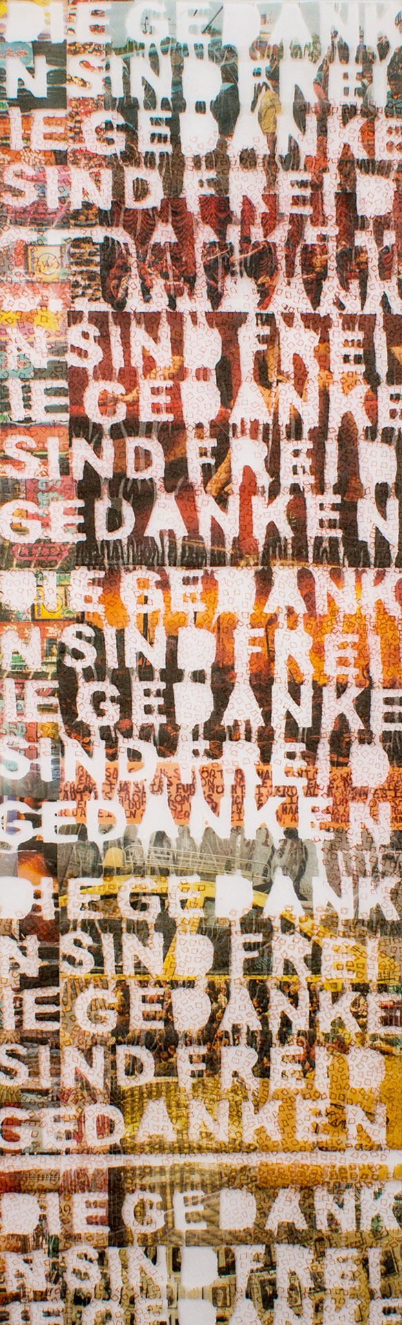 Papierlamination von eigenen Fotos, Siebdruck und eigene Typographie · 60 × 253 cm