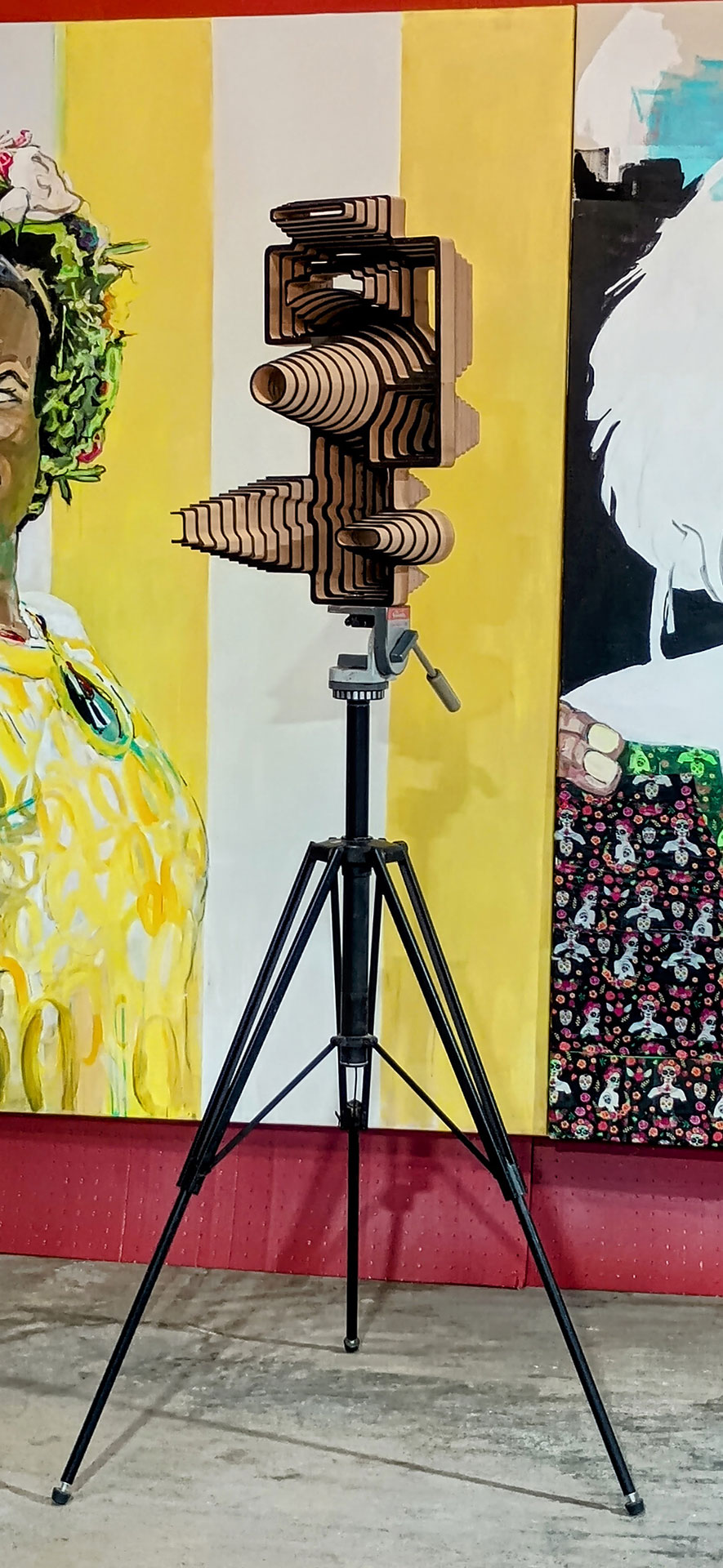 Kanadische Zeder, gesägt, montiert, Acrylfarbe schwarz · 30 × 40 × 60 cm auf verstellbarem Kamerastativ