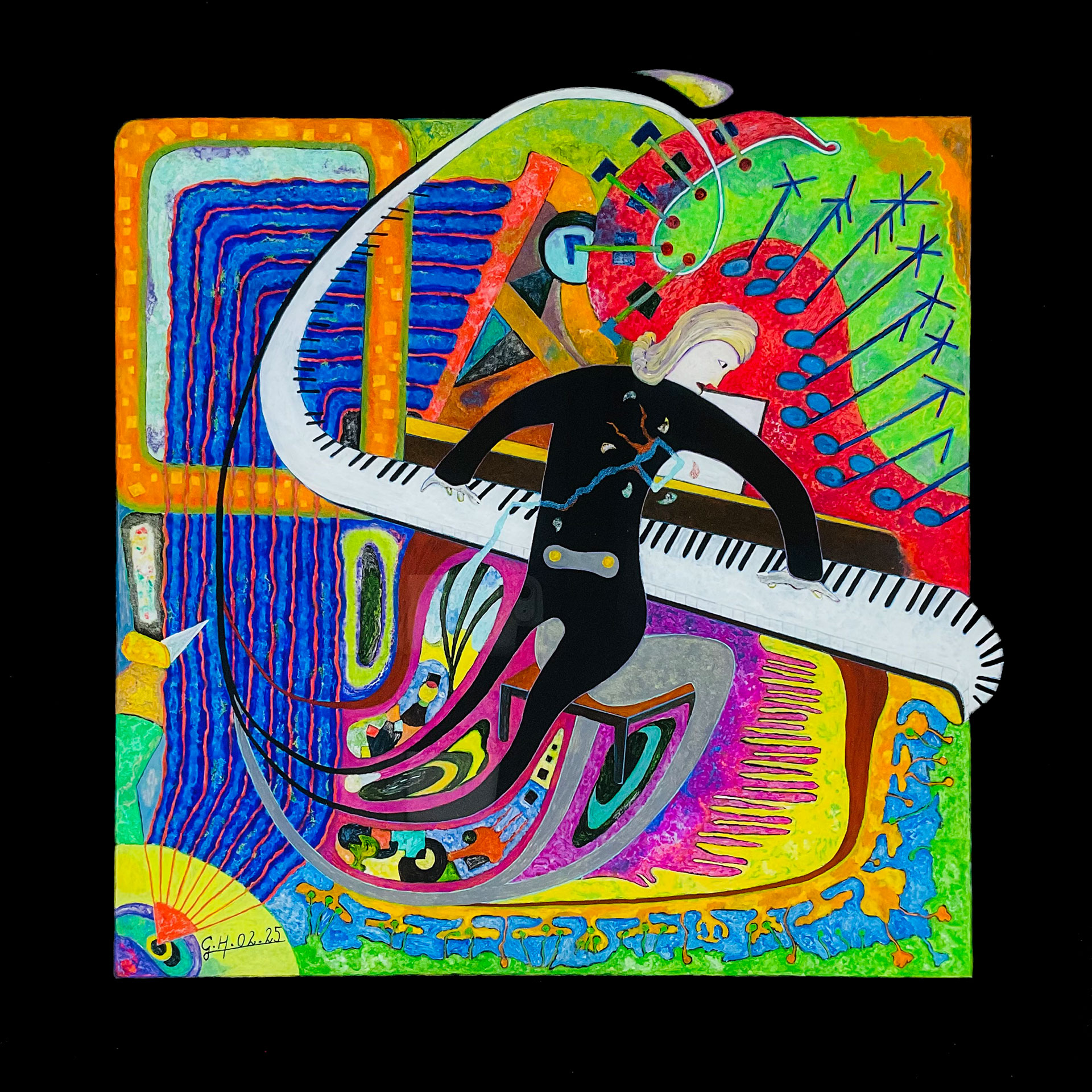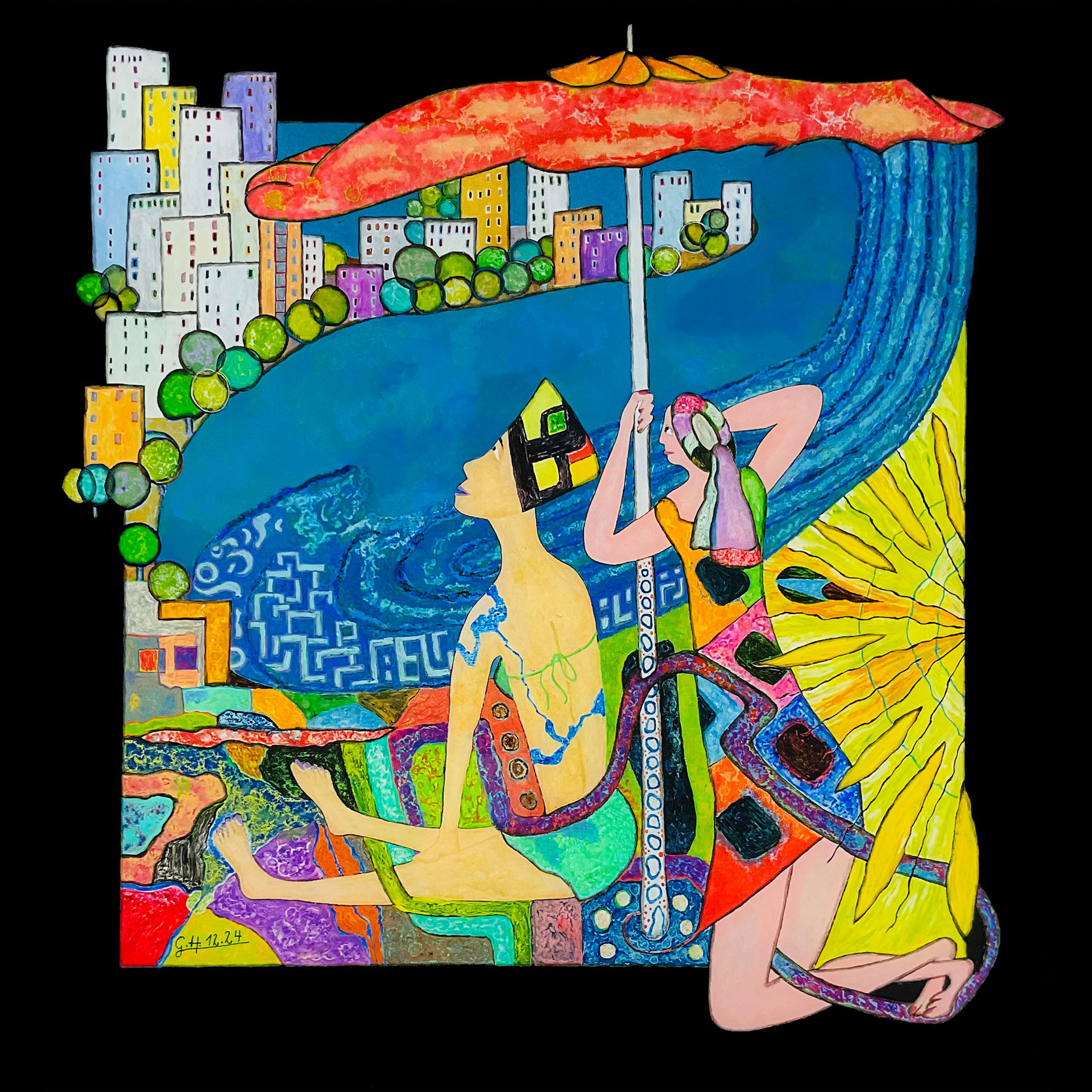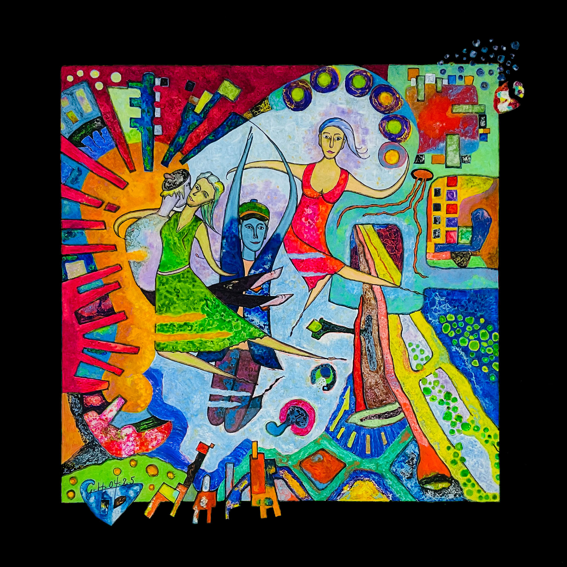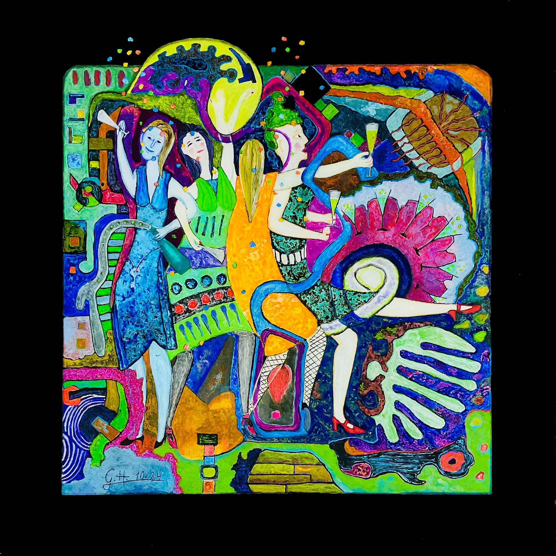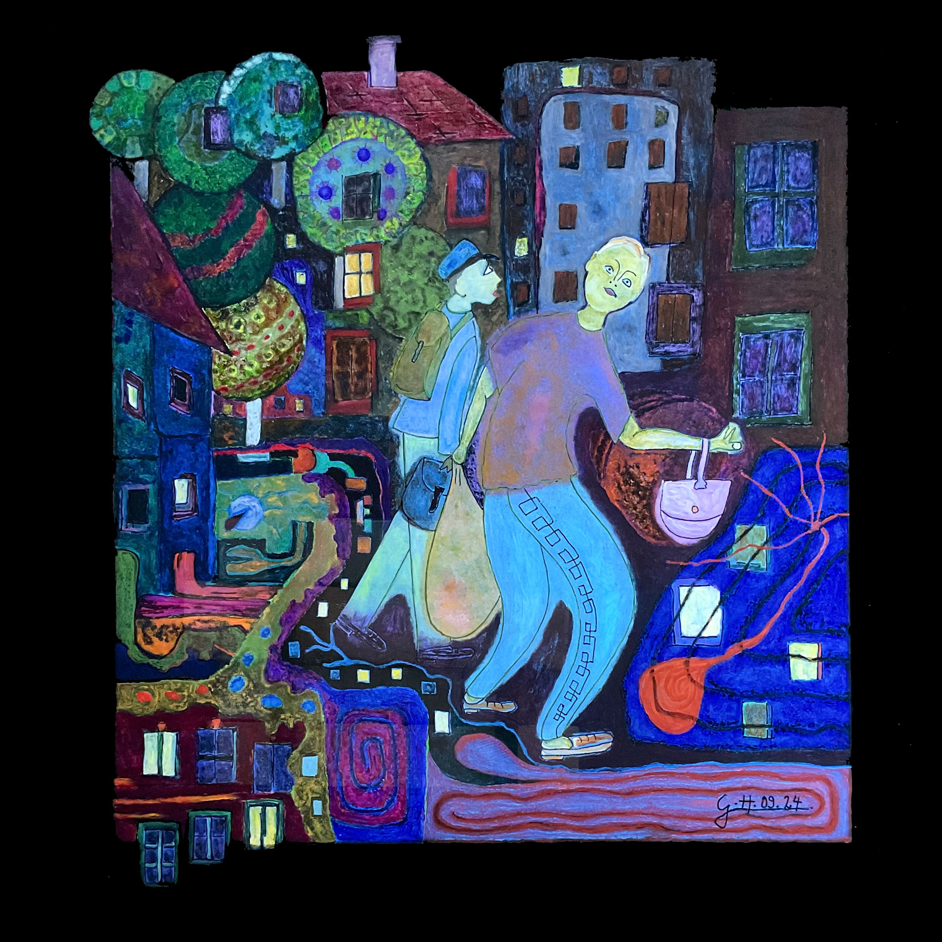 In den Jahren 2021/22 verlegte ich meinen malerischen Wohnsitz an den Horizont der Gegenständlichkeit. Dieser Ort ist etwas Faszinierendes, er weckt Neugier, er ist offener und durchlässiger als eine Grenze und er bietet mir alles was ich mir als Maler nur wünschen kann. Ich kann mal weit ins Ungegenständliche vordringen oder mich weit ins Gegenständliche zurückziehen, ganz wie es mir beliebt und ich brauche nicht auf Menschen in meiner Malerei verzichten, denn die sind mir lieb und heilig. Ja und davon gibt es jede Menge hier, die urigsten Typen in den unterschiedlichsten Situationen. So schnell wird mir der Stoff nicht ausgehen. Seit etwa 2 Jahren versehe ich meine Bilder mit einem gemalten Passepartout, über den ich an passenden Stellen hinausmalen kann. So entstehen zwangsläufig Bilder, die den Rahmen sprengen.